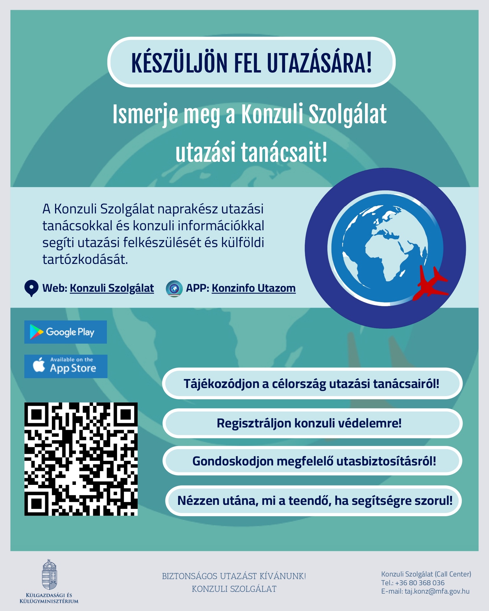 A Konzuli Szolgálat folyamatosan frissülő utazási tanácsai mindenképpen segítik a külföldi utazás megtervezését, így kérjük utazása előtt Ön is tájékozódjon honlapunkon: https://konzinfo.mfa.gov.hu/utazas/utazasi-tanacsok-orszagonkent, regisztráljon konzuli védelemre és töltse le a Konzinfo Utazom mobilalkalmazásunkat. Utazás című menüpontunkban egyéb hasznos információt is olvashat utazása előkészítése érdekében. Készüljön fel utazására!